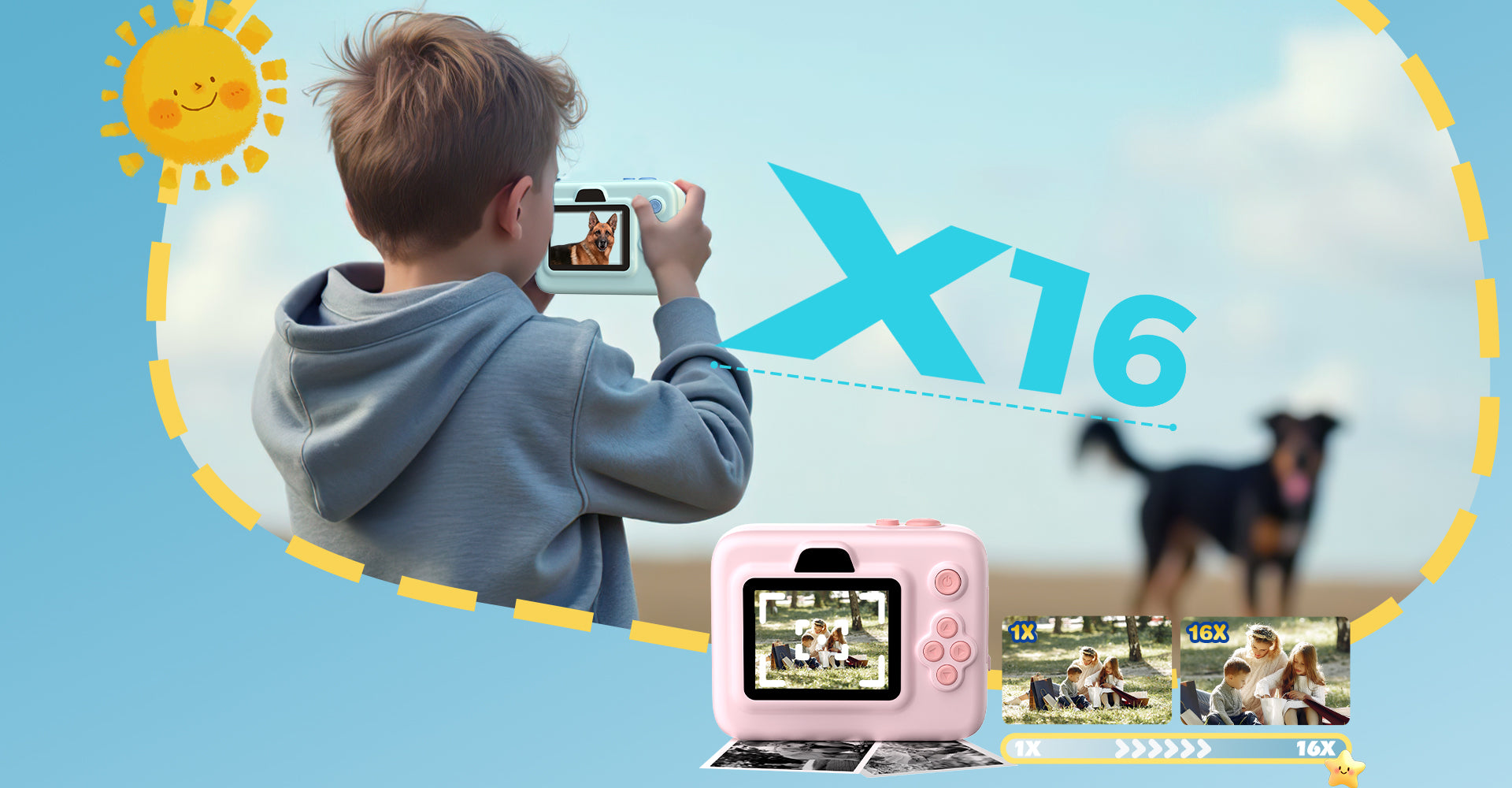 With dual lenses and 1080p video capability, the HC200 kids digital camera captures sharp, vibrant moments. A 16x zoom, continuous shooting mode, and timer allow children to explore photography with ease. Its top-left flash ensures perfect shots even in low light, while fun filters and stickers add a creative flair.